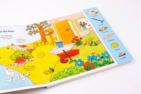Een stevig kartonboek vol zoekplaten om van alles op te zien en ontdekken! Concepten leren Samen met Dikkie Dik kunnen nieuwsgierige peuters op speurtocht in huis en in de tuin. Op de zoekplaten vinden ze allerlei elementen terug die in de kantlijn afgebeeld staan. Zo leren ze waardevolle concepten en woorden tijdens het zoeken en spelen!